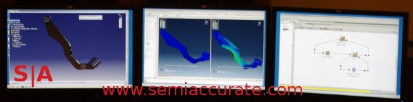 At a briefing a few weeks ago, the company brought out two partners to show off how Eyefinity works in the high end space. The demo above consisted of three pieces of Dassault software, Catia, Abaqus and Isight, all made in to one seamless workflow system. Instead of one or two monitors, you can have all three parts open, running, and accelerated at once. The same type of layout was shown with 3DS Max, Mudbox and Photoshop, everything you need at once.