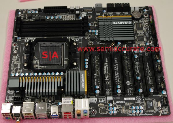 What you are seeing is the first AMD based UD7 board, the high end line from Gigabyte. It has an AMD 990FX chipset, AM3+ socket, and 6 PCIe 16x slots. To top it off, when was the last time you saw a board with both 4-way CrossfireX and 4-way SLI? It looks like the Nvidia exclusive lockout licenses just went poof. Isn’t that sad?