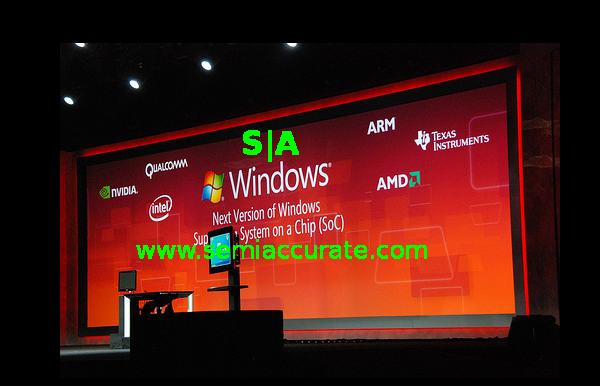 The picture was smuggled out of an MS conference detailing the tablet phone boondoggle, and lays it all out. There are not four but five launch partners, three WARM and two WX86 (Rhymes with “Zbigniew”) partners. Those two aren’t hard to guess. So much for rumours of AMD not having a tablet strategy or a fan-less capable product, eh? Enjoy.S|A