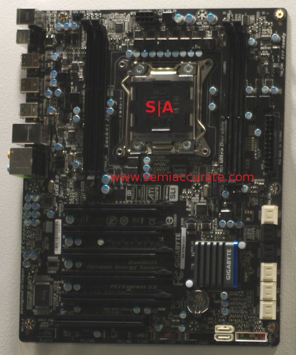 The board is based on Intel’s X79 chipset for the upcoming Sandy Bridge-E CPU, aka Socket 2011 chips. This is the true Sandy Bridge part, 4 memory channels, a chipset with USB3 support, and SATA 3 as well. It is not bandwidth crippled like the current versions, so it should be the gamer part of choice in Q4.