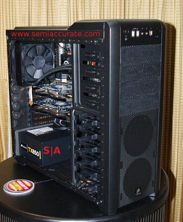 Then comes cases, a new line in fact called Carbide. Carbide is a lower cost gamer/lan party targeted case, thinner and slightly less featured than the older Graphite. The low end 400R has 10 fan mounts, side mounted removable drive bays, and a under-mobo cable routing space with the familiar rubber grommets. The case has USB3 mobo headers, not pass-throughs, a lot of front mounted ports, and space for a long PSU too.