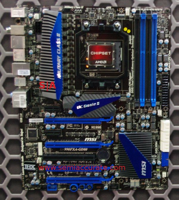 Yes, MSI had an X79 board on display too, and this one is called the X79A-GD65. It has X-Fi, 10 SATA6 ports, 4 DIMM slots, and three real PCIe slots. If you are serious about GPU performance, this is one of two chipsets to consider. The other is the 990FXA-GD80 below, the AM3+/Bulldozer board in the same class. This one does 3-way SLI and 4-way CrossfireX, and has a lot more bandwidth than the X79, so 4 GPUs are quite doable. What the X79 vs 990FX battle comes down to is raw CPU speed vs connectivity, which one matters more to you?