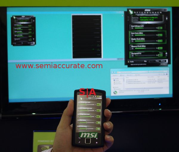 Last up is the Afterburner utility controlled by an Android phone that Mads wrote about yesterday. Two neat bits to add, one is that it is a PC to PC direct link, not over the net, and fully secured, not that it matters much. The other bit is that it works in real time, so you don’t have to drop out of a benchmark to adjust the settings. This is really handy, it allows for a lot of fine tuning on the fly, and the hardcore set will really like it. In use, it looks like this.S|A