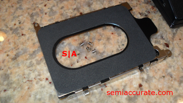 There are four screws near each of the corners that hold the 2.5″ drive bay mount to the physical drive. You need to remove these screws to detach the mount.