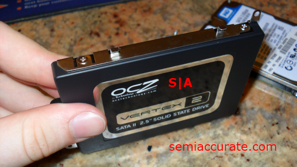 Then you need to separate the 2.5 inch driver from it’s SATA II and SATA power connect slots which are built into the motherboard by pulling on the drive in a horizontal motion towards the outside of the case.