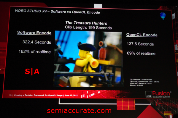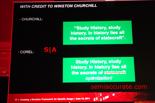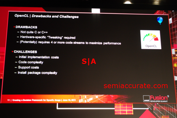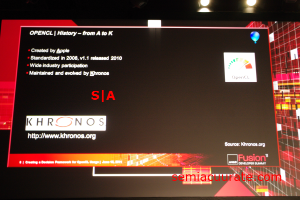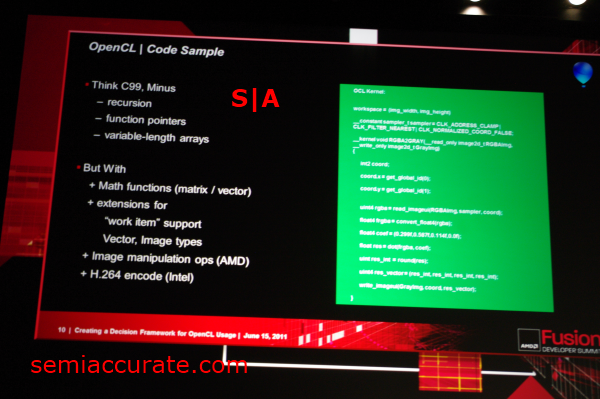 After a short introduction by Manju Hegde and John Taylor, the keynote began with Brown asserting that developers are adopting OpenCL mainly to help them utilize all of the available processing resources that modern PCs have. In more simple terms, the move by software developers to OpenCL is purely about performance. About a quarter of the audience members raised their hands when Brown asked if they were using OpenCL already. Which is surprising considering the relative immaturity of the OpenCL standard.