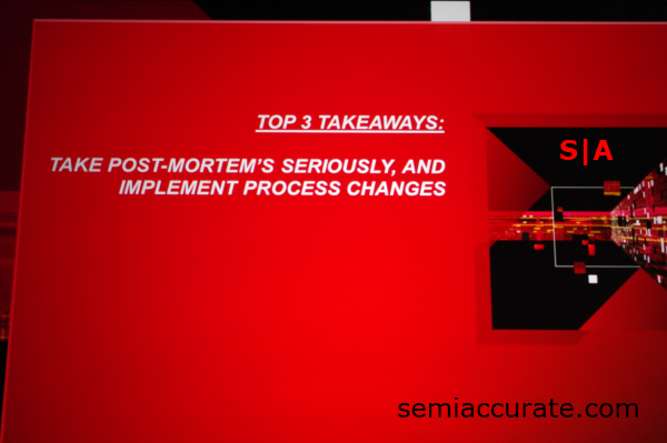 He also went out of his way to talk about postmortem analysis. Brown polled the audience, asking how many of them had participated in a postmortem analysis that never had anything come of it. His count of hands in the audience was 40 percent. Brown stressed the need for quality postmortem analysis and the process changes that would flow from such an analysis by using a number of historical quotes.