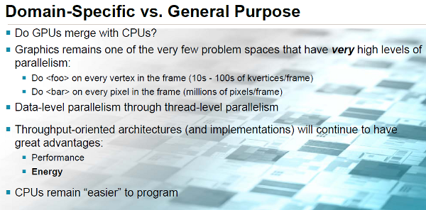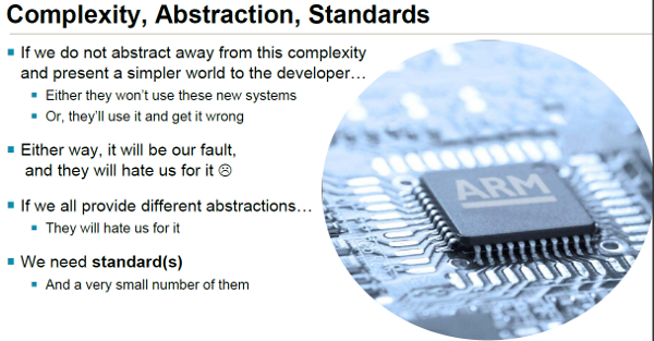 Once the problem was laid out, the talk turned to standards, aka how to make the silicon useful in the face of the new reality. For the most part, CPUs are fast enough for almost all non-server tasks, the bottlenecks are in other places now. Two more CPU cores won’t help any more, if you have six and use two, eight buys you nothing. The most problematic bottleneck today is graphics. ARM has Mali, AMD has ATI, and Intel still doesn’t have basic driver functionality.