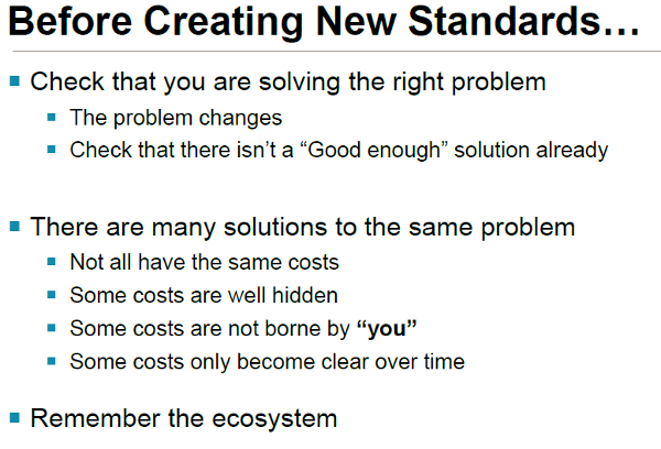 Standards are well and good, and a thin software layer to make things just work is the way forward, no question there. Unfortunately, there is a bigger problem that may come up from the process, making the “One true standard, praise it’s APIs”, that is making it wrong. This brings things from “real mess” to “intractably painful”, leading to forks and worse. The one thing worse than “One true standard” is “Many one true standards”. Why? Because then you have many ways to do things wrong, not just one.