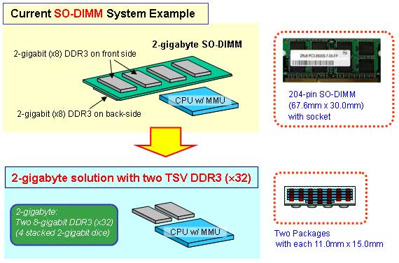 As can be seen on the illustration provided by Elpida, the new memory modules have a capacity of 1GB and 2 of these can replace a single SO–DIMM of 2GB.