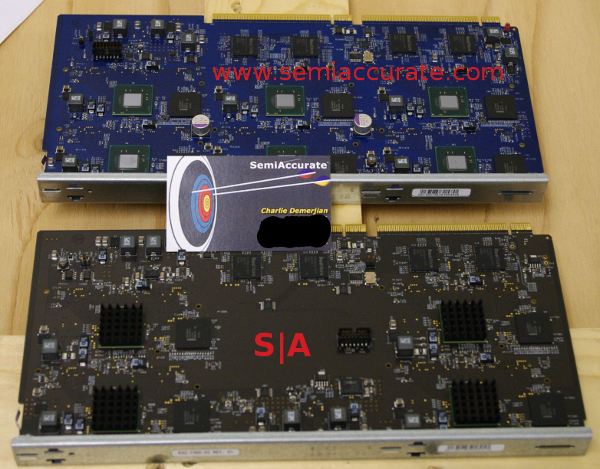 There is also PCIe bandwidth available, the 4 SeaMicro ASICs on each card support 6 1x sockets, so each chip is capable of at least PCIe2 2x. While SeaMicro would not say how much each one can support, PCIe2 tends to come in 1x, 4x, 8x, and 16x widths, 2x is entirely possible, but very uncommon. Given the two PCIe connectors on the top of the cards, I would bet each chip can support at least a 4x connection, possibly even 8x.
