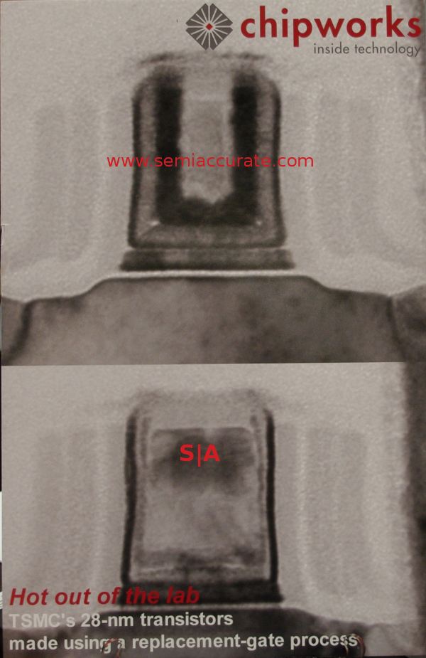 That leaves the 28nm SiON aka 28nm LP, something that may be viable for a low power ARM SoC, but not a high power GPU. SiON at these geometries is far too leaky. Enter the good folk at Chipworks, and the poster they had at their SemiCon booth. They had just finished taking apart an FPGA based on a 28nm TSMC process, and guess what they found? HKMG. Sort of.