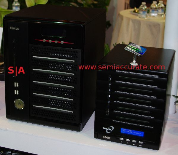 The first new box is basically a new set of guts in the old N4100 chassis. The new version is called the N4100Eco, and it is different from the older N4200Eco in basically every way. The N4200Eco was an N4200 with a UPS built in, the N4100Eco is an N4100 with the new XXX (Atom based in Thecus parlance) boards, and tweaked for lower power use wherever they could. Thecus is claiming the new Eco will draw <10W in standby, and costs less than the old one too.