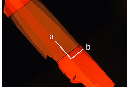 A single crystal of the new organic semiconductor material shown in polarized light. is approximately twice as fast as the parent organic material from which it was derived. The white scale bar at the bottom center of the photo represents 10 microns or 10 millionths of a meter. (Credit: Anatoliy Sokolov)