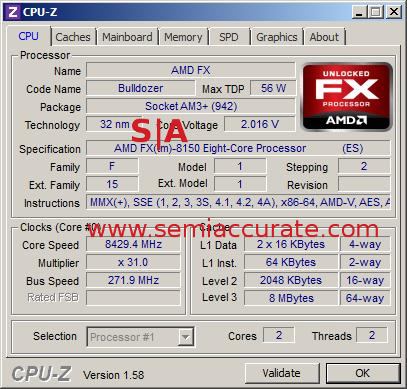 The short story is that on August 31, 2011, AMD smashed the world record for CPU speed by a large margin. The old record, 8308.9MHz was destroyed by the overclocked Bulldozer, “Team AMD FX” hit 8429.4MHz, well over a percent up. If you think about it, this record is more remarkable because the old was set with a single core cacheless Celeron, this one is with a full 8-core bulldozer, L3 cache included. Not only does this new chip clock faster, but it also does it with 8 times the cores.