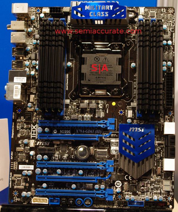 The board above is the X79A-GD65(8D), the newest X79 enthusiast board from MSI. If you are wondering what the difference is between that and the older X79A-GD65 shown at Computex, the 8D stands for 8 DIMMs. Short story, the GD65 has 1 DIMM per channel, four channels, the GD65(8D) has 2 DIMMs per channel, four channels. That is about it.