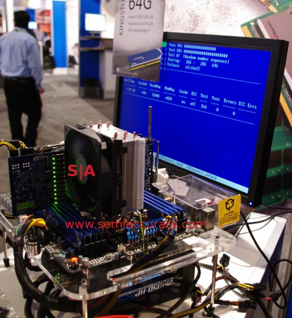 Luckily, help is on the way. Just to the left of the Audio Studio demo was a Sandy-E system cranking away on a memory tester. I think the Kingston Spokesmodel was on level 4 at this point, but I don’t play that game enough to tell. For me it gets boring after 0x00DEADBEEF, but others seem fascinated.