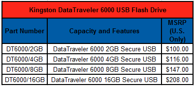Now the DataTraveler 6000 isn’t Kingston’s first encrypted flash drive, with the DataTraveler 4000 predating it. It also does not exist in a vacuum, with companies such as Lexar and IronKey offering competing solutions. But it does offers an impressive set of features that should give it a leg up on the competition, and allow Kingston to increase their margins until the forces of competition bring the DT6000’s price into a more palatable range. $50 a gigabyte for the lowest model seems a bit steep when you can pick up a an unsecured drive of the same size for $6, but for the buyers that need their data secured with one of these devices it’s probably safe to say that money’s no object. We’re sure a US military contract is in the offing.S|A