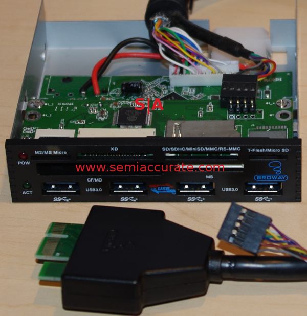 Even nicer is a device, other than a memory stick, that actually uses that available bandwidth. They are on the market, and VIA was demonstrating one, a Broway 4-port hub plus card reader. If you have a USB3 equipped PC, you really need something like this, it is one of the few things you can put in a case to use the 3.5″ drive bay sanely. Given the cost of the controller, it should be pretty cheap too.