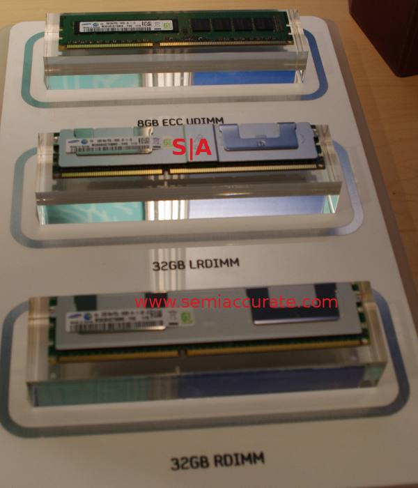 The last things Samsung had to show off don’t do well in pictures, they just look like any other memory chip. That said, DRAM doesn’t do well in pictures in general, it all kind of looks the same. le sigh. In any case, Samsung was showing off a 4Gb DRAM chip, that is 512MB per part mind you, which made up the 32GB DIMMs above. To balance that out, they had 1.25V DDR modules, and 4Gb LPDRR2 chips too.