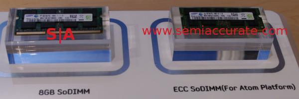 A few booths away, Crucial was showing off a production 8GB SO-DIMM, and Samsung has one too. Actually, Samsung has two too, with one being ECC protected. It says for Atoms, but most craptops won’t need ECC, so it is probably aimed at industrial designs and embedded applications.
