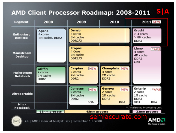 Bulldozer, in it’s current form, first showed up in AMD’s roadmaps back in 2008 shortly after AMD’s former CEO, Dirk Meyer, first took office. It was announced to be a 32nm part code-named Orochi and was slated for 2011.