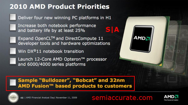 Bulldozer was confirmed to have taped out in Q2 of 2010 during AMD’s quarterly conference call. This came after S|A’s own Charlie had a little mix up with the Bulldozer and Llano tape out dates.