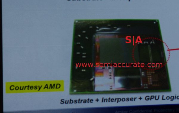 AMD (NYSE:AMD) has some top secret prototype GPUs floating, and SemiAccurate managed to get a picture of one. With that, here is an upcoming, but not soon, AMD GPU that we won’t name, along with an interposer and stacked memory. No more details or legs get broken. Enjoy.S|A