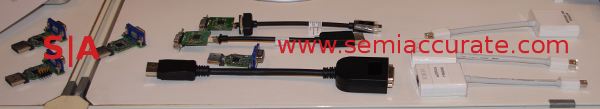 The versions shown off were not high end, it was pretty obvious that they were aiming for inexpensive but solid devices, and were not claiming anything else. The USB -> HDMI dongle they were demonstrating was running a 1080p movie at full frame rate over a USB2 connection. There was obvious compression, but you had to look for it. That said, it ran smoothly and never stuttered, but if you did look carefully, you could see minor artifacting. Luckily though, they are promising USB3 variants in the near future that will not have this problem, and hopefully do it at a low cost.