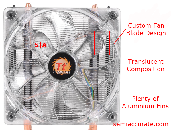 Now the more clever readers might have already questioned why anyone would buy the Contac 39 when you can just buy the Contac 30 and slap another fan on it? Well that answer is relatively simple and it has to do with the fan design that Thermaltake used on these two coolers. The fans are made of a clear plastic and have a special blade design which Thermaltake claims reduces the noise profile of their cooling solutions compared to those with traditional blades. The only other issue your cunning plan might run into is mounting the fan, because while the mounting slots for a second fan are still present on the Contac 30, you won’t have enough of Thermaltake’s rubber anti-vibration mounts to attach the second fan. Oh, and the shade of blue LED on your aftermarket fan might not match that of Thermaltake’s fan…