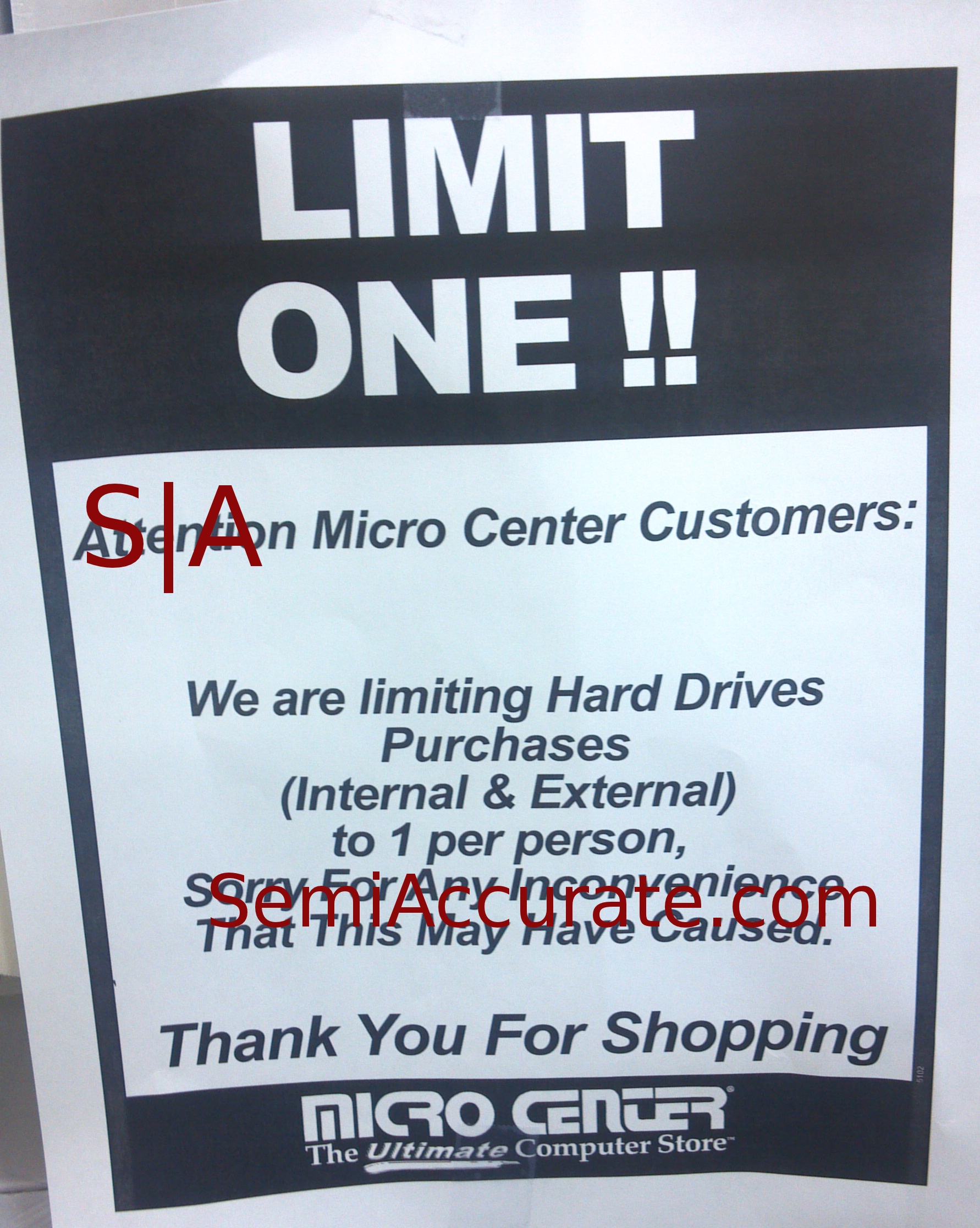 Both Samsung and Western Digital are sourcing parts such as head stacks and drive motors from suppliers in Thailand and because of the torrential rain that supply has been disrupted. Also, both companies are restricting supplies to the retailers in order to avoid having PC manufacturers begin obtaining their drives that way. Microcenter, based in the US, has already taken limiting steps as seen by their in store signs.