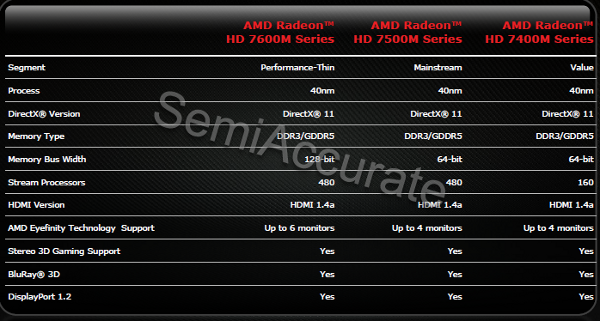 AMD (NYSE:AMD) is launching 3 all (not) new (at all) GPUs today, we welcome the (not) all new Radeon HD 7400M, 7500M, and 7600M. AMD is the first to readily admit these are renames with a few tweaks, so don’t get your hopes up for amazing new, well, anything.