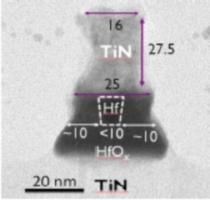The area of the cell is 100nm² and is based on hafnium/hafnium-oxide as the switching material. This material is placed between conventional contacts in a cross bar array. The contacts are made of titanium-nitride.