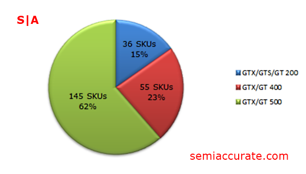 Now Nvidia’s GTX/GTS/GT model prefix can make generation SKU counts difficult. For example if you were to search for the GTX 500 you would end up with results for only the 500 series cards that had the GTX prefix, and not the lower end models the GT 520 or GTS 250. So you’ll have to bear with us as we work around that limitation.