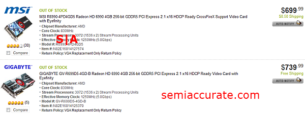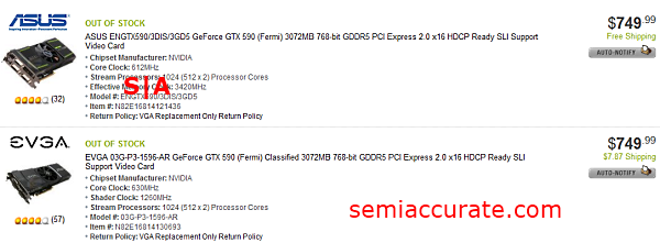 As you can see all of these cards are out of stock. Additionally these SKUs are all siting in the astronomically high $700-$750 price point. UPDATE: Since these screen shots were taken one of the GTX 590 SKUs has come back into stock and then in short order listed as out of stock again.