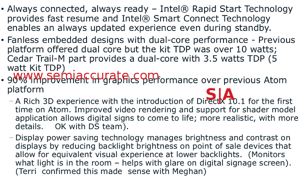 Page 21 continues the hilarity, and it is a target rich environment. “90% improvement in graphics performance over previous Atom platform .” Har har, I guess the deficit to the competition was too large to compute with mere Intel CPU, especially one with 64-bit mode fused off for customer monetary extraction reasons. Pentium FDIV bug resurfacing? Luckily, that 90% also includes, “A Rich 3D experience with the introduction of DirectX 10.1 for the first time on Atom. ” Except that Cedar Trail doesn’t actually do DX10.1. Luckily, the DS team seems to have approved it anyway. Did I mention that all the competition has DX11 offerings? Does it make sense to Terri and Meghan? It doesn’t to me.