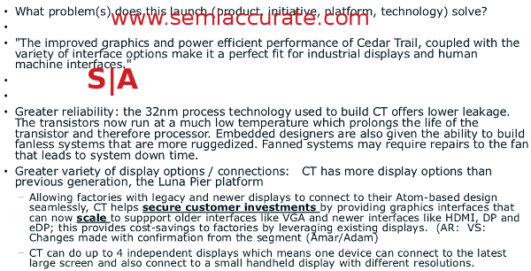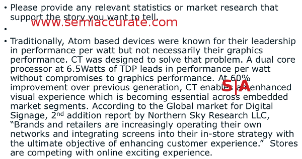 Page 24 gets painful. “What problem(s) does this launch (product, initiative, platform, technology) solve? ” The next line is blank. Not coincidence? Buy an ARM SoC or Brazos, they can solve problems.