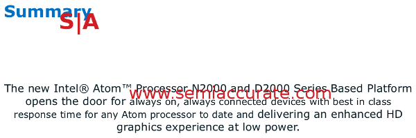 The short story is that Atom has now moved in to the 32nm world, a year later than promised, under performing, priced too high, incompatible with the things users want, and with still non-functional drivers. Luckily, the main advance for the new chip, DX10.1 support, was silently removed, and almost all traces of that feature scrubbed from the new release documentation. If you want the raw numbers on the chips, the Atom N2600 and N2800, read this.