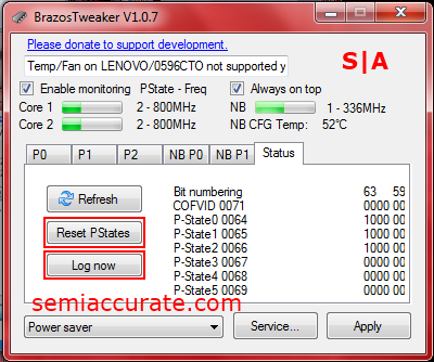 This is the interface that you’re initially greeted with when you launch BrazosTweaker. The core clock readouts are located just above the row of tabs. These can tell you the current P-State, the small number, and the current clock, the large number in MHz, of your APU. Something to take note of is the “Always on top” check box, which is useful when you’re running multiple stress tests and modifying voltages. Also, I’ve highlighted the voltage setting box, which is probably the most important setting that this tool can change. Just above the voltage selection box is the clock dividers which are user configurable. So if you’re looking to under-clock your APU in addition to dropping its voltage this is one way to go about it.