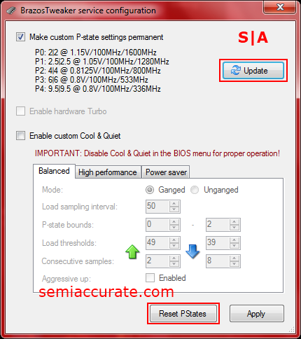 When you click on the “Service…” button next to the “Apply” button at the bottom of the window it launches this new window. The first thing that you’re going to want to do here is to transfer your tweaked settings into this service by hitting the “Update” button. This will load the current configuration data from BrazosTweaker. My data is shown under the first check box. Certain newer Zacate models, namely the E-450, E-300, and the C-60 offer a small turbo function. The X120e’s E-350 does not support that function and thus it’s not configurable.