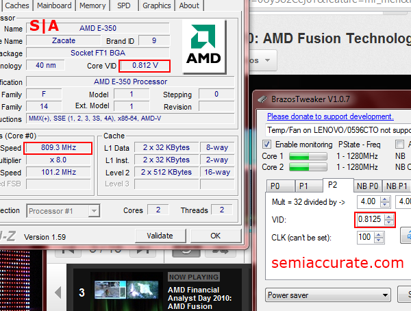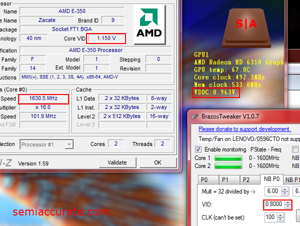 For my P1 Northbridge stability test I looped an Aero flip windows scroll comprised of 12 different applications. This put a small enough load on the Brazos GPU to ensure stability, without bumping the Northbridge into its P1 state. Unfortunately, BrazosTweaker doesn’t have full support for my X120e. So in addition to the tool being unable to report the temperature or fan speed of the system, I wasn’t able to change the voltage of Northbridge’s P1 state. As evidenced by my ability to set and apply a ridiculously low voltage which should have crashed it. Obviously changing the voltage of the Northbridge P-States on Zacate is finicky business.