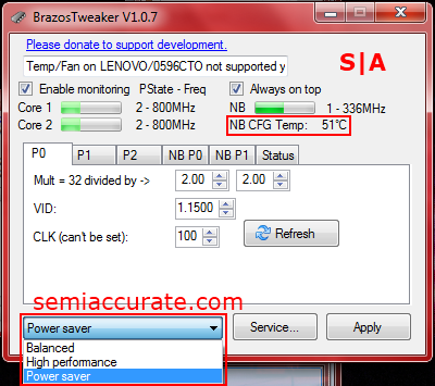 BrazosTweaker includes a couple of temperature monitoring services including one that reports the Northbridge temperature. It also has an extremely useful drop down menu that instantly changes the Windows power plan. This allows you to force the P0 state on both the CPU cores and the Northbridge by selecting the High Performance plan.