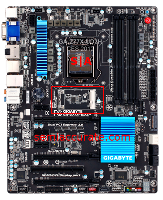 The thing I want to highlight here, other than Gigabyte’s thoughtful layout, is the mSATA slot in the center of the board. You may have noticed it on the Sniper 3 and UD5; its purpose is to allow users to install mSATA drives for SSD caching, which will again be a big feature in Intel’s high-end chip-sets.