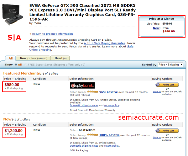 Take a second to look at those prices… What was the MSRP on the GTX 590 at launch again? $699. At this point it looks as if Nvidia and its partners have pulled the plug this particular product. As to the why of the matter, the decision could have been made because of the smaller margins the GTX 590 offered over the GTX 580 or because of a lack of demand in the face of the HD 7970, or an imminent launch. Whatever the reasoning, the GTX 590 seems to have disappeared quietly.S|A