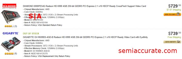 Now let’s turn to the HD 6990. Last time we checked this card was in short supply and going in and out of stock depending on when you checked Newegg’s listings. This month things seem to have stabilised to some degree. Of the two listed SKUs one of them is actually in stock. The most likely catalysts (pun intended) for this change is the shift in high-end demand from the HD 6990 to the new HD 7970.