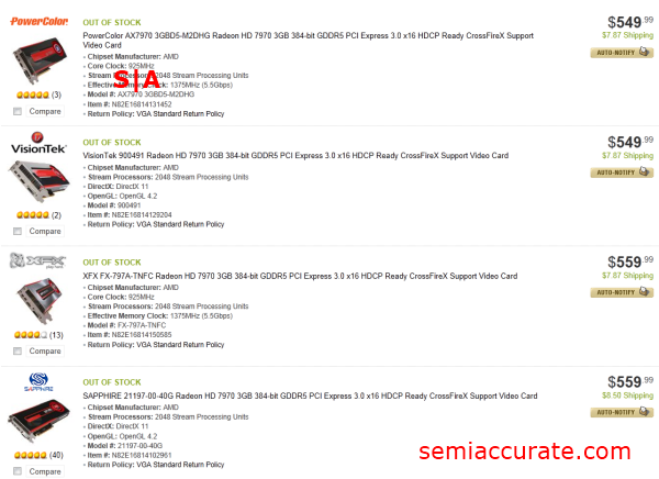 With the recent launch of AMD’s new single GPU flagship, the HD 7970, in mind we decided to check back in at the popular US online retailer Newegg.com to see what availability was like. Unsurprisingly, all of the nine SKUs Newegg has listed are out of stock. Prices on these SKUs start at AMD’s supplied MSRP of $549 and go up from there. The XFX Black Edition version of the HD 7970 takes the crown for the most expensive SKU listed at a cool $599.