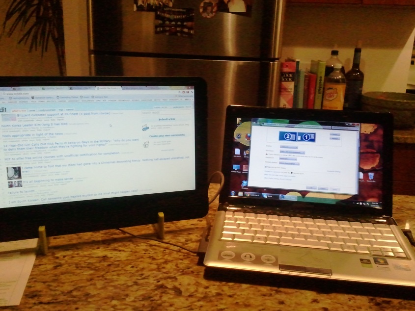 This in itself is something completely new, or it would be, if Toshiba hadn’t beaten them to the punch. In July 2011, Toshiba released the much-better-named “Toshiba USB Mobile LCD Monitor”, a 14” 1366×768 mobile monitor with no laptop attachment capabilities, but nice build quality. The Toshiba monitor retails for about $20 less than the GeChic product, but unfortunately has poor brightness when powered by USB, relies on Windows-only software (sorry Mac, Linux, or BeagleBoard users), and weighs 2.8 pounds. The GeChic’s svelte 1.9 pounds is hard to beat.