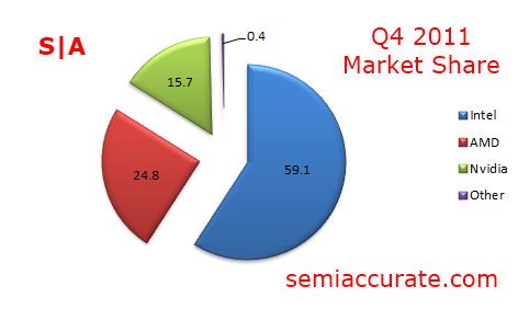 One dark spot in the quarter was a 12 percent decline in discrete GPU sales quarter to quarter. This is down 3.5 percent compared to the Q4 2010. The decline could be linked to the delay of AMD’s discrete GPU refresh which usually happens near the beginning of the quarter, but only began to emerge at the very end of Q4 this year. This delay in refresh could also be responsible, at least in part, for Nvidia’s 3.7 percent market share gain in desktop discrete segment.
