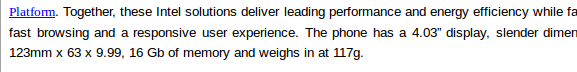 The full sentence reads, “The phone has a 4.03” display, slender dimensions at 123mm x 63 x 9.99, 16 Gb of memory and weighs in at 117g.” Also note the type of memory is not listed, it could be RAM, it could be flash, or it could be something else.