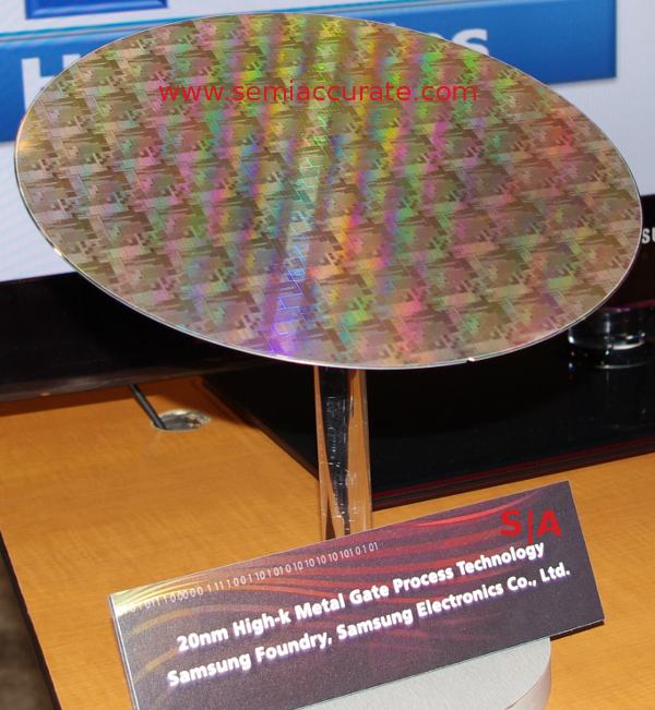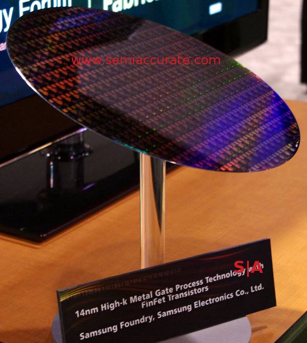 Samsung wasn’t going to be shown up by IBM at the wafer bragging sweepstakes, so they showed off a 14nm wafer and a 20nm wafer. OK, IBM did it a year ago, but now Samsung has it too.